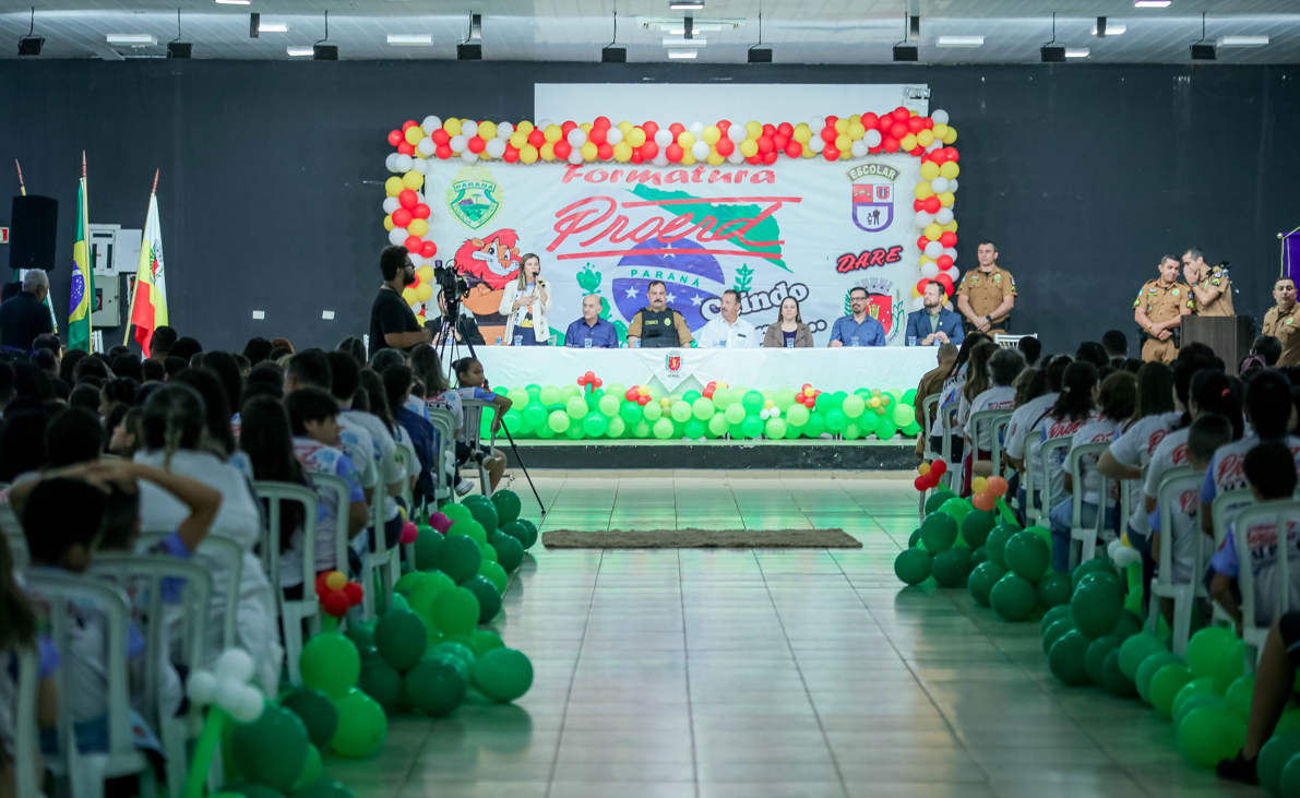 Nesta terça-feira, 11 de junho, mais de 1,1 mil alunos do 5º ano de 19 escolas municipais de Maringá participaram da formatura do Programa Educacional de Resistência às Drogas (Proerd). O evento, realizado no Pavilhão Branco do Parque de Exposições, celebrou a conclusão do programa com uma grande festa.